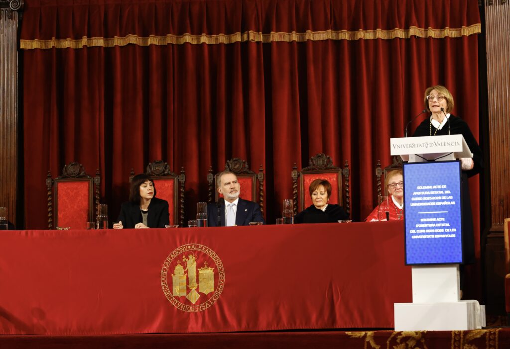 Este acto, celebrado en el Paraninfo de la Universitat de València (UV), que cumple su 525 aniversario, lo ha presidido el Rey Felipe VI, que ha estado acompañado también por la rectora de la universidad anfitriona, María Vicenta Mestre y la ministra de Ciencia, Innovación y Universidades, Diana Morant. La lección inaugural del curso, bajo el título «La Universitat de València en el marco del origen y la evolución de las universidades españolas», ha corrido a cargo de la secretaria general de la UV, María Elena Olmos.