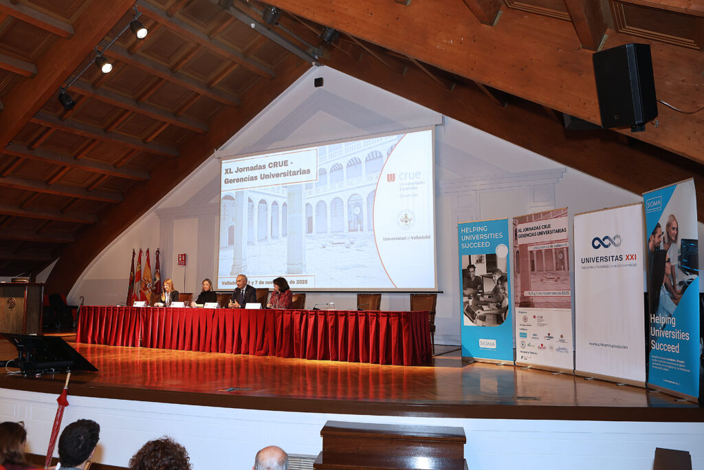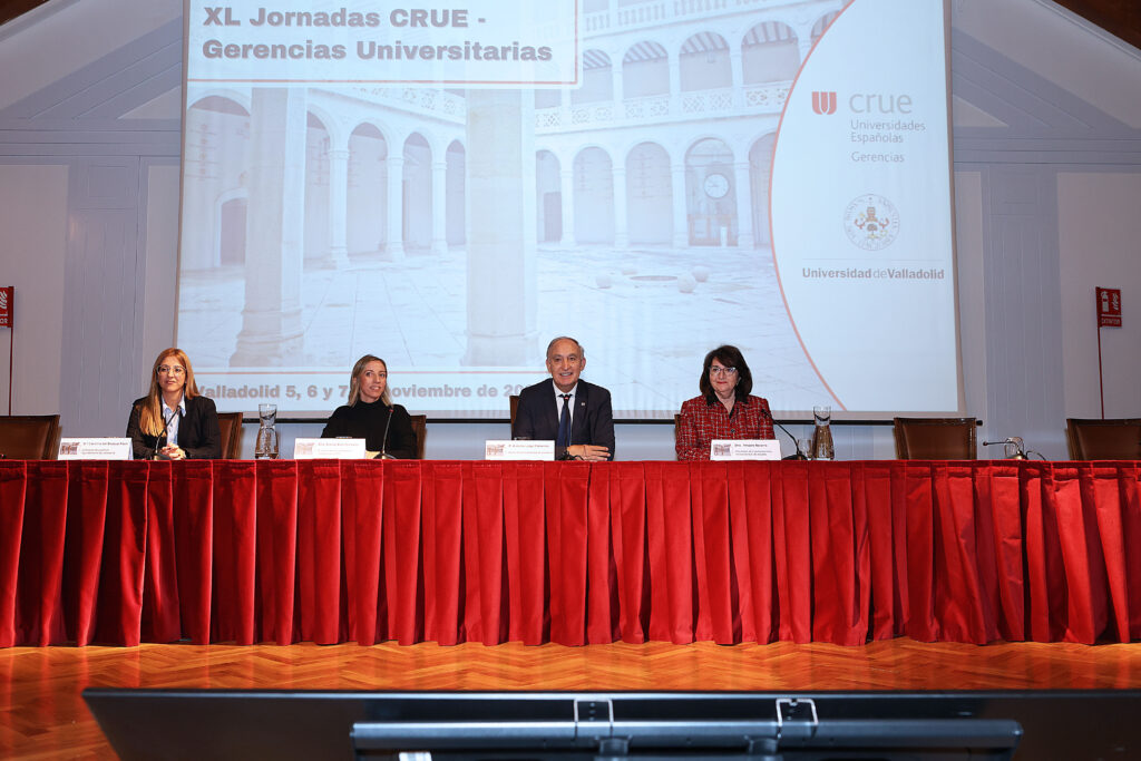 Valladolid, 6 de noviembre de 2025. La Universidad de Valladolid acoge desde el miércoles 5 de noviembre y hasta este viernes día 7, las XL Jornadas Crue-Gerencias, un encuentro que reúne a más de 220 participantes de universidades españolas para debatir sobre los principales desafíos y oportunidades en la gestión universitaria. El acto inaugural contó con la presencia del rector de la Universidad de Valladolid, Antonio Largo Cabrerizo; la presidenta de Crue-Gerencias y rectora de la Universidad de Alicante, Amparo Navarro; la directora general de Universidades de la Junta de Castilla y León, Blanca Ares; y la concejala de Juventud del Ayuntamiento de Valladolid, Carolina del Bosque.